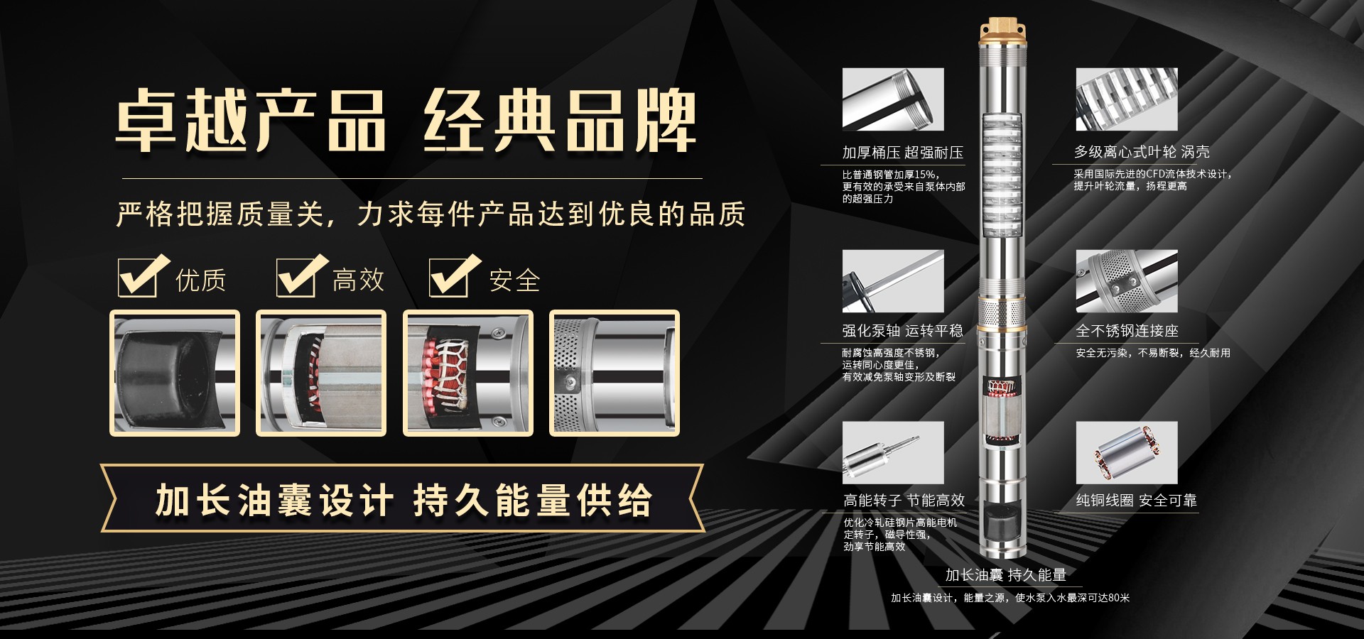 不僅僅是泵,更是流動的科技。十多年來,本公司堅持走:以質(zhì)量求生存以科技創(chuàng)新求發(fā)展,重合同守信用的道路,生產(chǎn)經(jīng)營得到迅速發(fā)展。更希望以后不管從發(fā)達城市到新農(nóng)村,從工業(yè)制造到尖端科技產(chǎn)業(yè)都隨處可見創(chuàng)江井泵的身影,創(chuàng)江深井泵已成為干萬用戶心目中優(yōu)質(zhì)和信心的保證我們將以優(yōu)質(zhì)的產(chǎn)品和最完善的售后服務來真誠與各界朋友開展廣泛的合作,共同創(chuàng)造一個美好的未來!